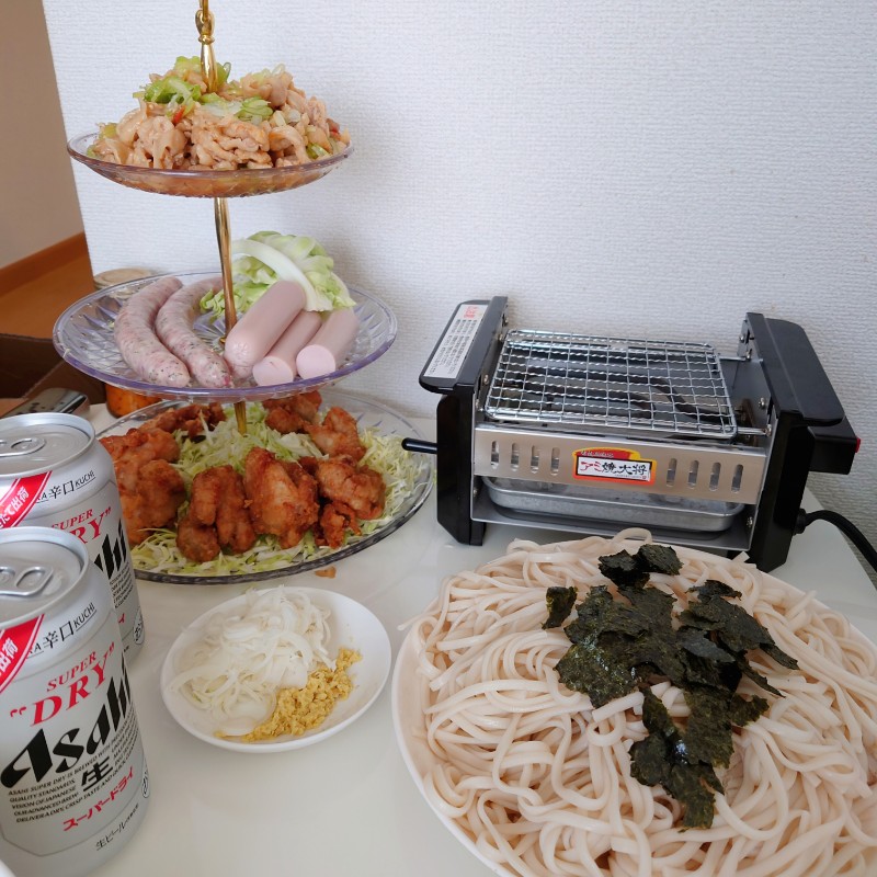 食材をテーブルにもって行き、酒を飲みながら焼き上がるのを待つだけでおいしい肴が出来上がります…