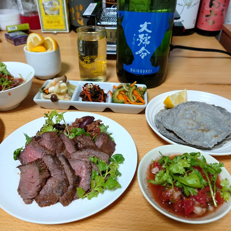 鹿肉のローストと自家製鹿肉ミンチのチリコンカンで晩酌の図