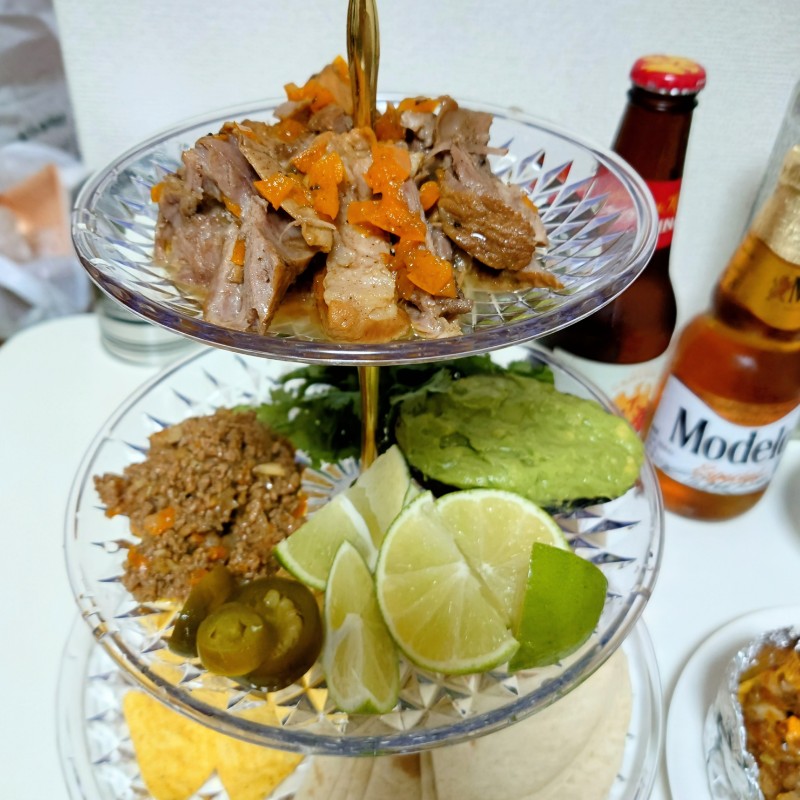 ワカモレ、トマトのサルサ、カルニータス…