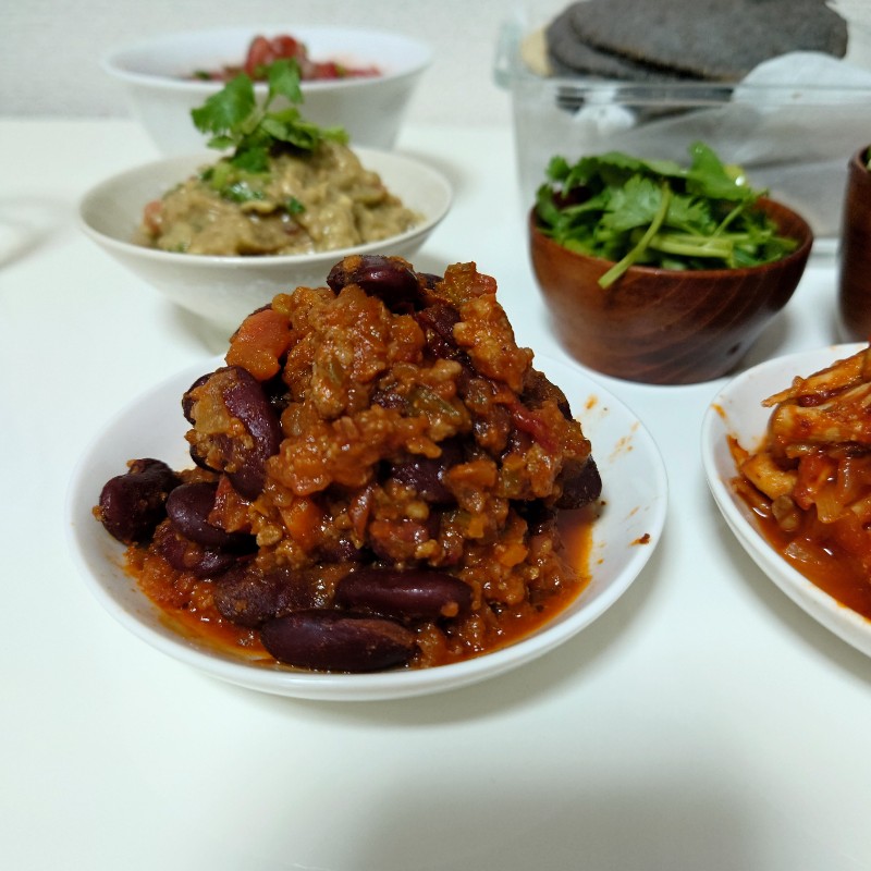 同じ食材にトマト缶とキドニービーンズの水煮を加えるとチリコンカン(これもテクスメクス)が作れます。
