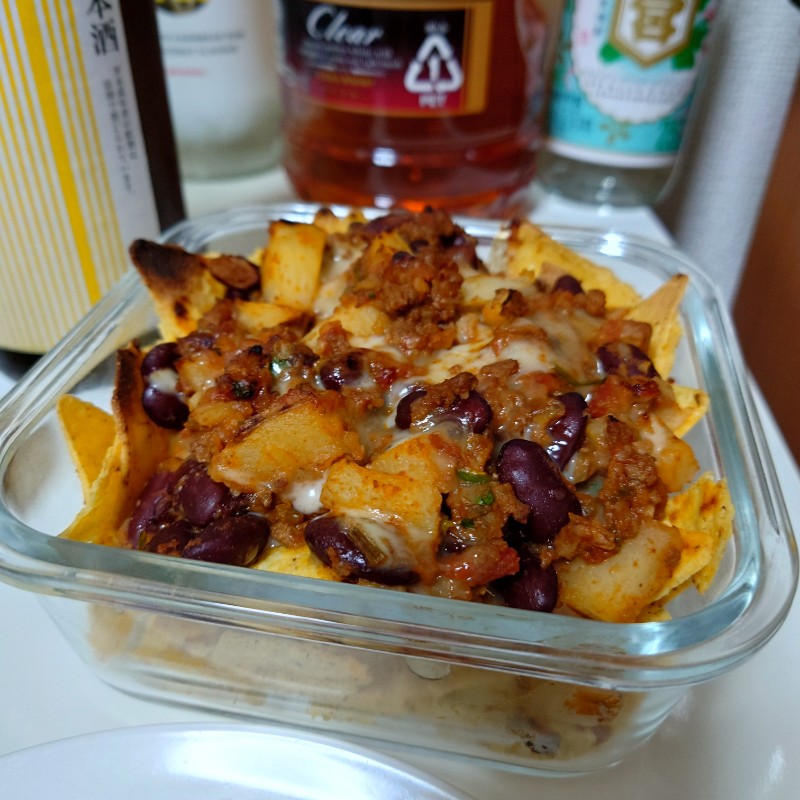 画像はタコミートの応用でトマト缶を足したチリコンカンとチーズを使って作ったナチョスです。