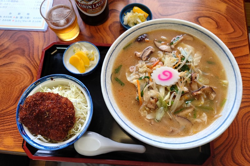 椎茸ラーメンとソースカツ丼のセットやホルモン炒め定食が人気だよ~